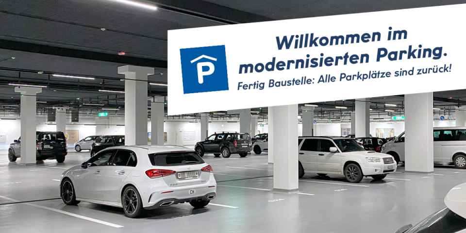 Auch wenn es draussen regnet und stürmt, gelangst Du trockenen Fusses in die Shopping Arena. Parke Dein Auto einfach in unserer modernen und hellen Parkgarage. Das